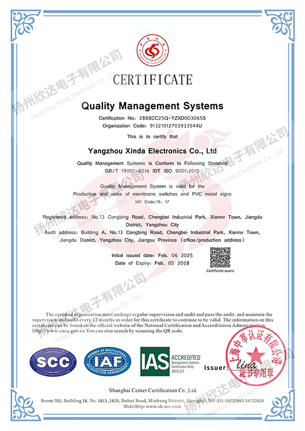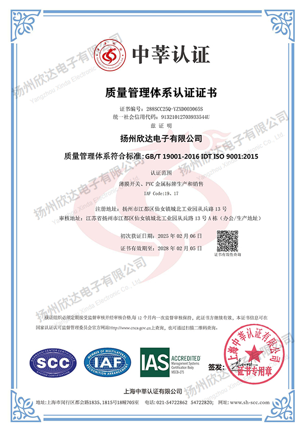 揚(yáng)州欣達(dá)電子有限公司是一家從事電子輕觸薄膜開關(guān),薄膜面板及PVC、金屬標(biāo)牌,不干膠貼,噴塑、烤漆絲印面板等各種絲印工藝的有限責(zé)任公司。公司位于風(fēng)景秀麗的文化名城江蘇揚(yáng)州市江都區(qū)。自1993年建廠以來,我們致力于信譽(yù)至上,顧客為首的原則,及時為廣大客戶提供合格滿意的產(chǎn)品:堅(jiān)持著質(zhì)量為首,持續(xù)改進(jìn)的方針,狠抓品質(zhì)管理,取得了客戶的認(rèn)可:履行著誠信、互惠的宗旨,贏得了客戶的支持和信任。目前公司擁有先進(jìn)的絲網(wǎng)印刷設(shè)備,熟練的業(yè)務(wù)技術(shù)骨干和嶄新適用的廠房,每年為全國各地的客戶提供數(shù)億的合格產(chǎn)品。我們把“誠信、務(wù)實(shí)、求精、創(chuàng)新”作為我們的企業(yè)宗旨,在經(jīng)營管理中貫徹“以人為本,精益求精”的經(jīng)營理念;在生產(chǎn)管理中嚴(yán)格按ISO9001質(zhì)量體系落實(shí)生產(chǎn); 在為客戶服務(wù)過程中按照產(chǎn)品的分類提供多種設(shè)計(jì)方案,讓我們產(chǎn)品更好體現(xiàn)客戶的理念。...